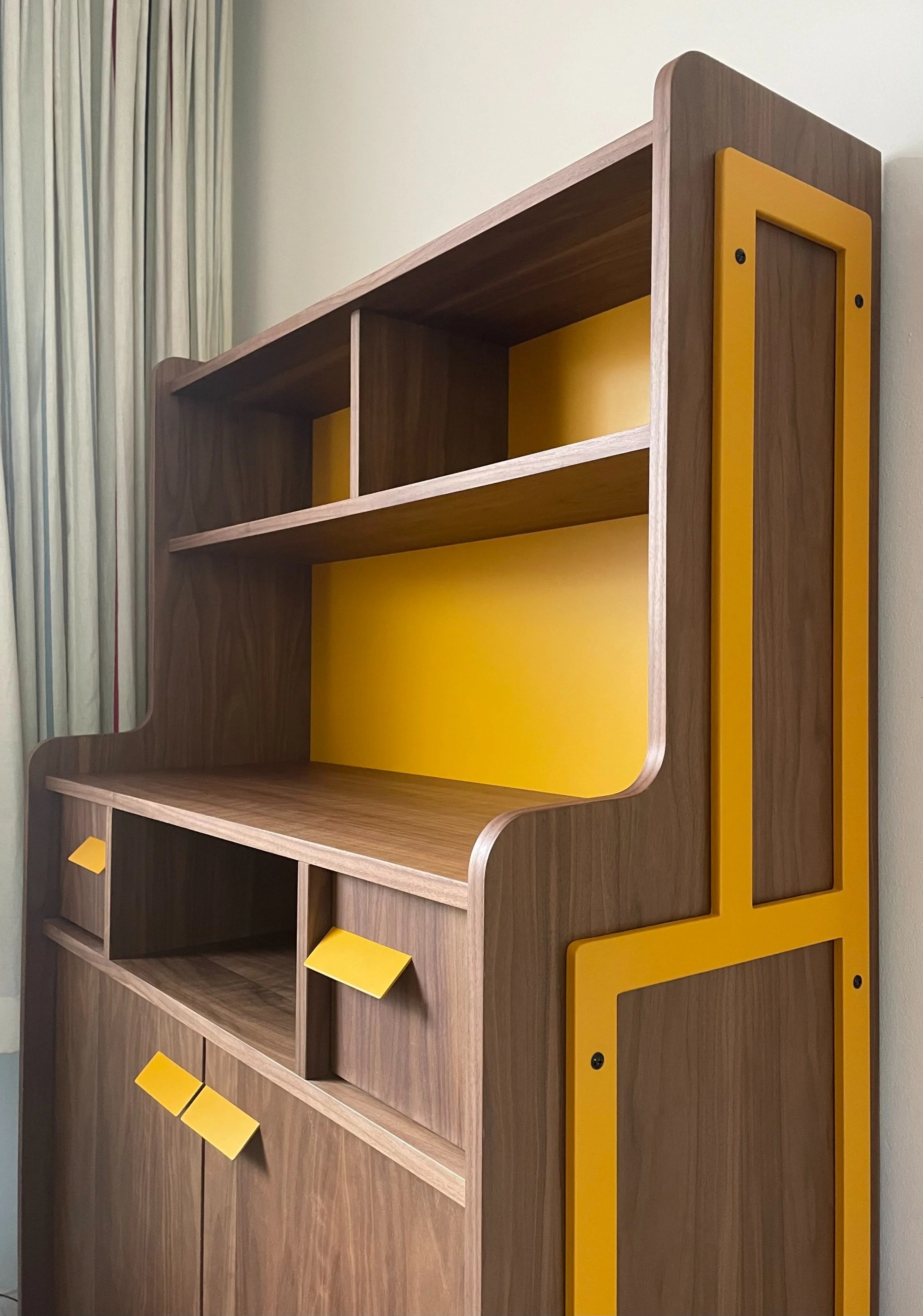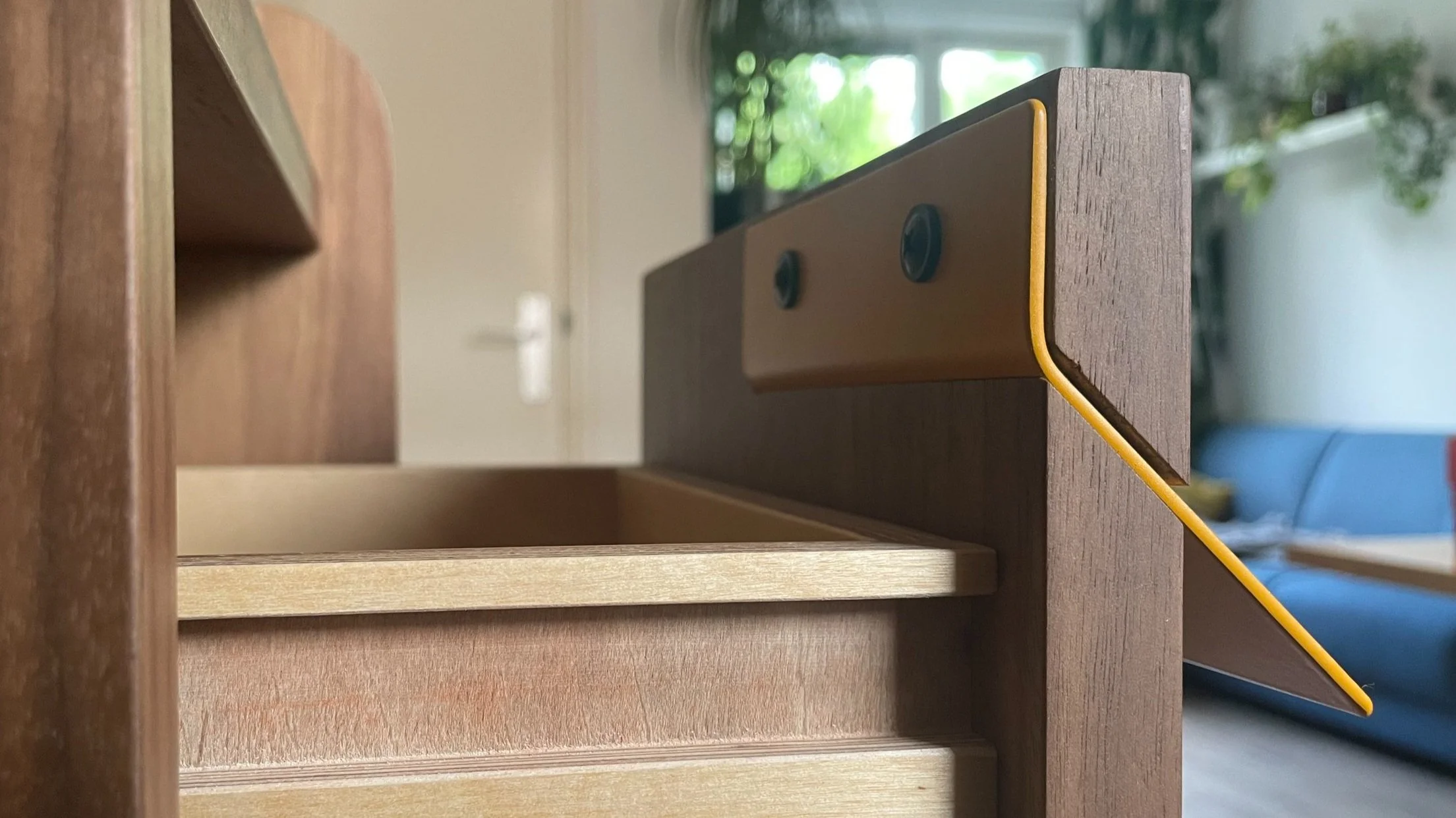 Een beetje oud bruin, een beetje nieuw geel… Notenhout muziekmeubel met stalen details in maisgeel. ⇩